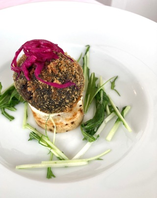 画像は締め的なイカ墨リゾットのコロッケ、このままでも美味しいしスープをかけて更に美味しい。
